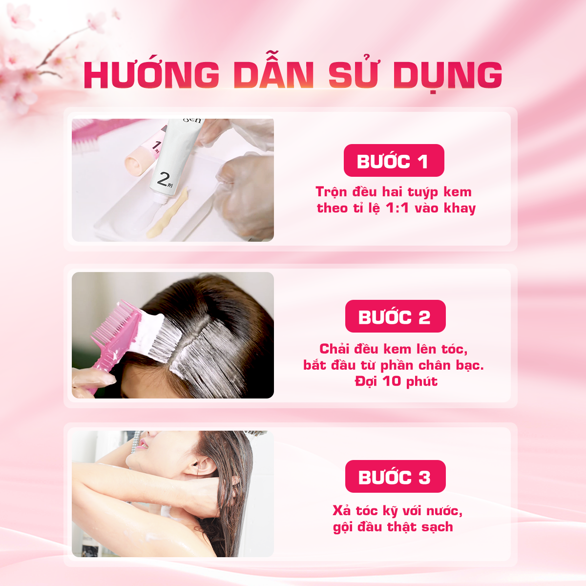 2. Kem phát triển màu: Water, Hydrogen Peroxide, Cetyl Alcohol, Stearyl Alcohol, Ceteeth-2, Citric Acid, Isostearyl Alcohol, Phenoxyethanol, PPG-4-Ceteeth-20, Propylene Glycol, Steartrimonium Chloride.